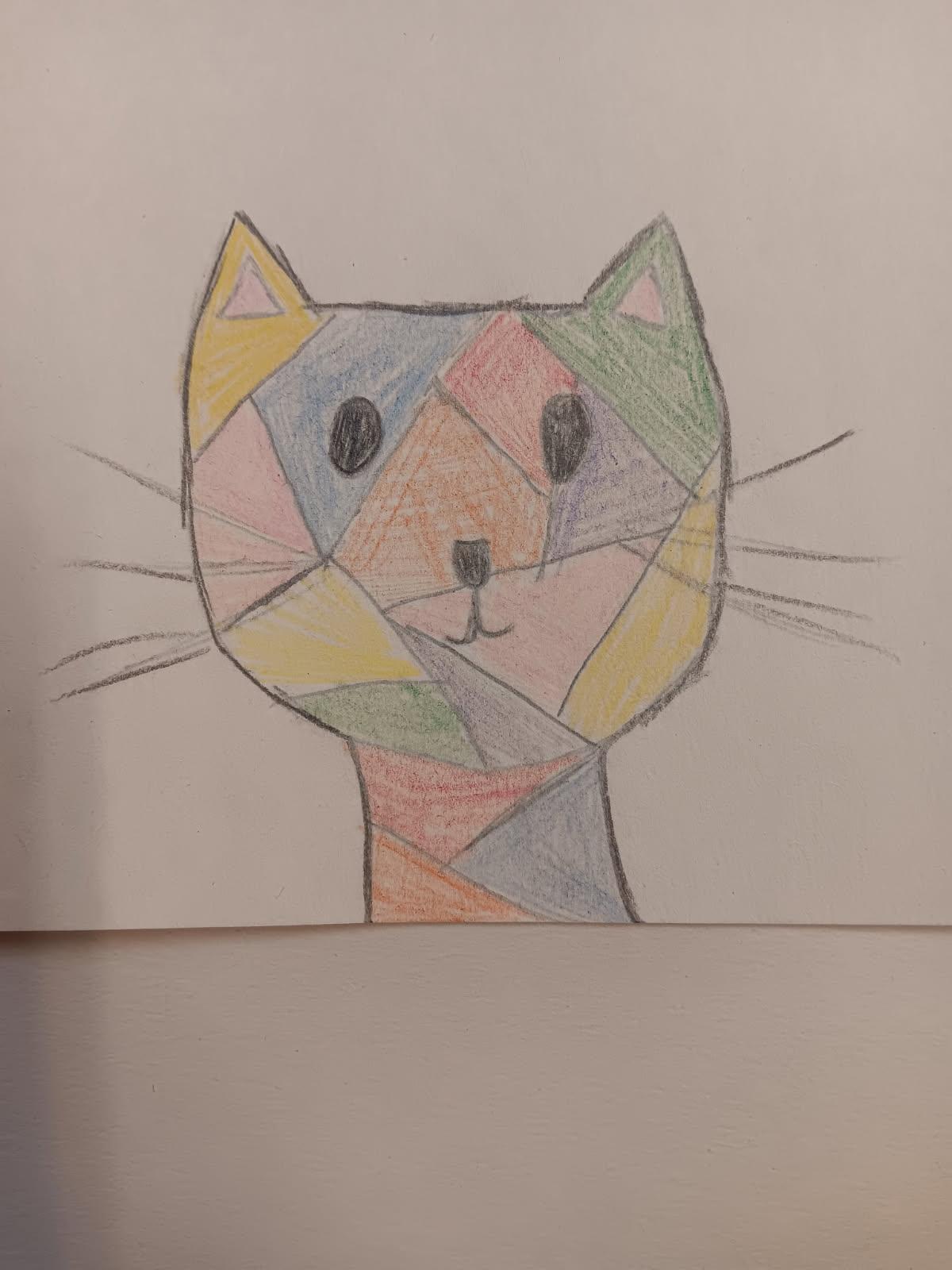 Showcasing SHA talent: This cat by Sophia in 7th is thinking, “Box, did someone say box? because if I fits I sits.”
